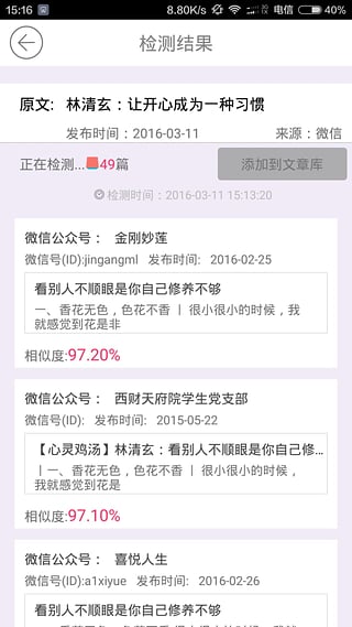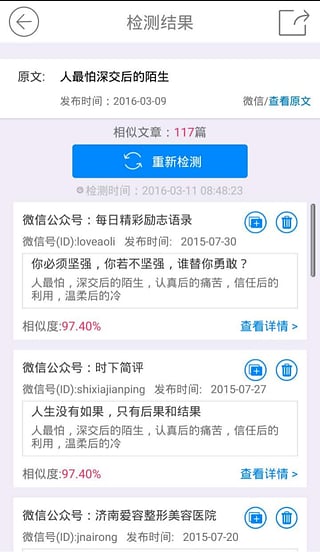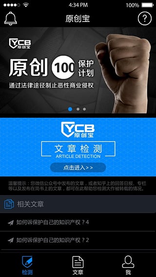 用户通过原创宝APP的服务功能,可以检索并保存微信、知乎和简书等平台发布的原创文章被微信公众号转载的数据,实现转载数据的云存档与证据保存;