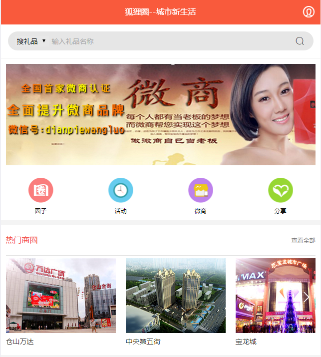 圈子(购物服务);活动(同城社交);分享(线上社交);微商(微商认证宣传)。