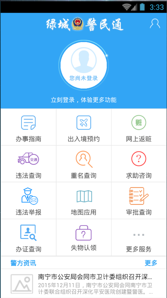 绿城警民通app是由南宁市公安局推出的一款本地警务服务应用,市民朋友可以通过手机随时了解最新的警务资讯,进行办事指南、出入境预约、违法查询、在线举办等众多的警务服务,非常的方便,欢迎需要的朋友来绿色资源网下载体验吧!