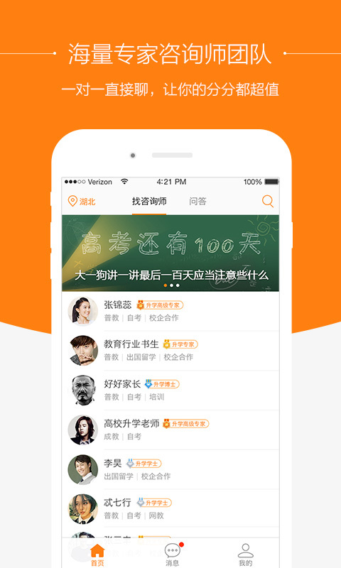 2.新增【找咨询师】,为高考学生提供专业的学业规划及志愿填报服务,可即时选择喜欢的升学咨询师进行;