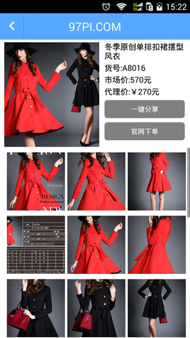 5.随便点一个商品,我们以上面的A8016为例,点A8016商品图,进了一个大家熟悉的九宫格页面了,这个时候,你再点一键分享,就到了你的朋友圈了,是不是很神奇很方便的。如果你的客人下单了,你也可以点下面的官网下单。