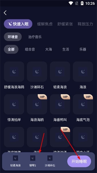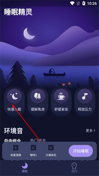 2、在快速入眠页面选择想要的环境音组合,点击开始睡眠。