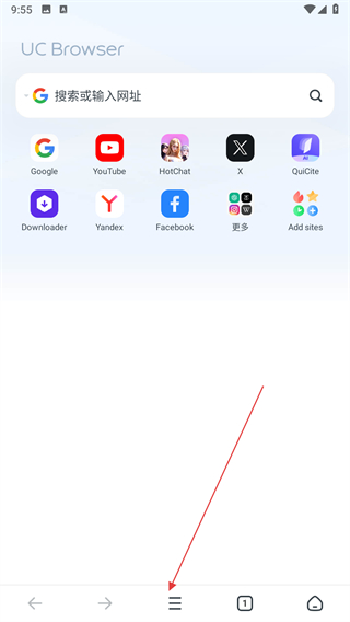 1、打开UC浏览器国际版软件,进入到浏览器主界面,在底部导航栏中找到并点击中间类似三条横线的菜单按钮,展开隐藏菜单选项。