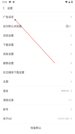 3、点击广告设定选项,进入广告拦截的设置页。