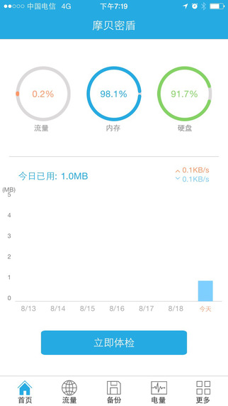 摩贝密盾为用户提供全面的手机安全服务。提供一键体检,病毒查杀,系统优化,电池管理,流量管理,安全擦除等功能,为您的手机安全护航!摩贝密盾实时监控您的流量使用情况,并根据需要给予您提醒,让您及时了解您的流量使用状态。
