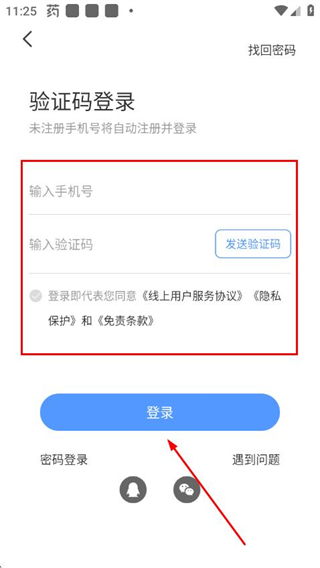 3、输入手机号、获取并填写验证码,勾选协议后点击登录,完成注册。