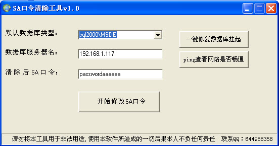 sa口令密码 没记住要怎么办?请用这款绿色易用的sa口令清除工具,本软件可以清除sql2000,sql2005的sa口令