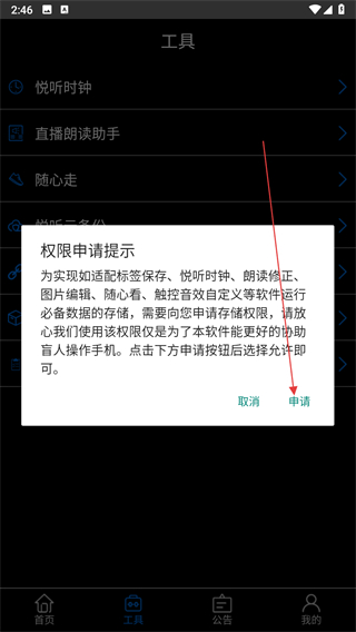 4、在权限申请提示框中点击申请按钮,按照系统提示完成存储权限的授予。