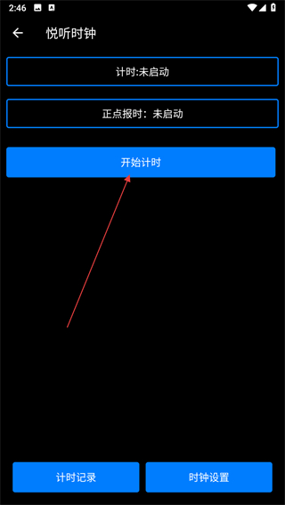 4、进入悦听时钟页面,点击开始计时,即可启动计时。