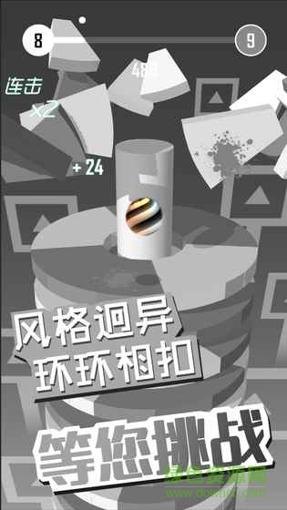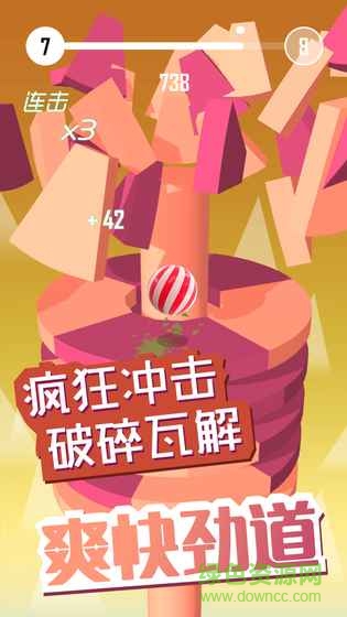 画风简洁清新又考验玩家反应能力的3D休闲小游戏。玩家通过点击屏幕的方式使小球砸在正确颜色的模块上,突破重重障碍,最终落到最后一层。游戏有几十种不同的配色风格,球球也有多种多样的皮肤形状。