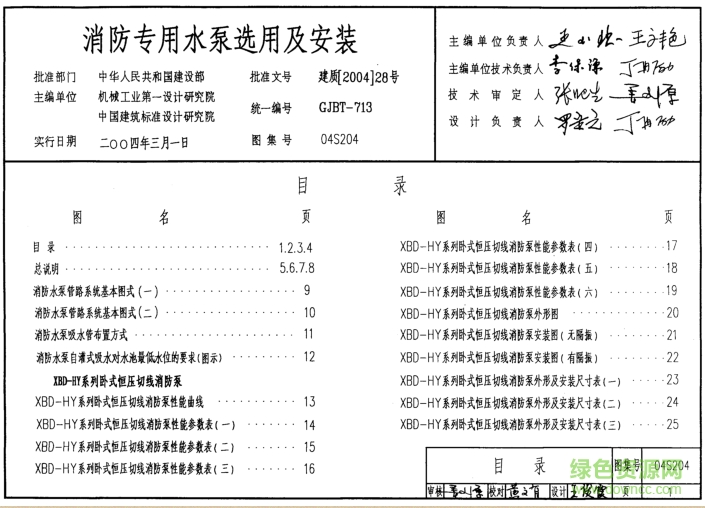 以前消防给水系统的供水泵采用普通清水泵,工程实践证明它不能很好地满足消防系统的要求。为此消防主管部门制定了《消防泵性能要求和试验方法》GB6245-1998,现在消防给水系统中均应采用通过该标准检测合格的专用消防水泵。为了在工程中正确选用和安装消防泵;同时解决设计中常出现的一些问题,标准院组织了4家生产企业共同编制了本图集。