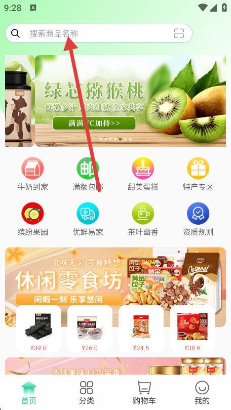1、打开优佳悦享App,点击首页上方的搜索商品名称搜索栏。