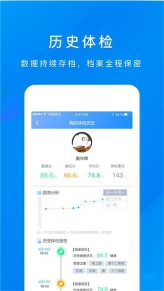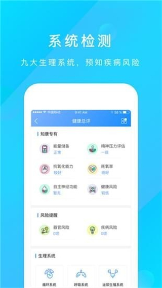 以“让人均寿命延长一岁”为宗旨,为您提供无创体检,身体评估,健康干预,个性化跟踪管理等服务。通过200多项检测数据带您了解身体即时状况,大数据算法下预测潜在健康风险,及时进行健康管理与改善,提高生命质量。