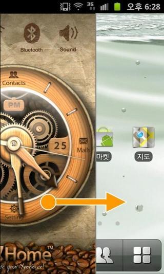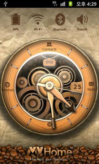 这款木质的时钟插件,透明的表壳下,还有不断转动着的钟表机械在不停的活动,看起来非常的酷。而且,这款钟表插件还将各种应用(短信、联系人、浏览器、设置)等集成到了表壳的四周,使用起来非常方便。你点击下方的设置按钮,然后会看到透明的表壳被打开了,露出了里面的各个设置选项,看起来非常奇特。