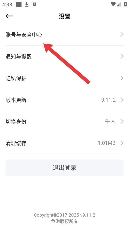 1、进入鱼泡网的个人账号设置页面后,点击列表中的账号与安全中心选项,进入账号安全相关设置界面。