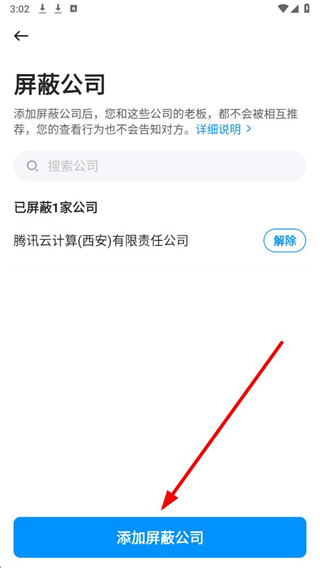 4、在屏蔽公司页面,点击添加屏蔽公司按钮,通过搜索找到目标公司后即可完成屏蔽操作。