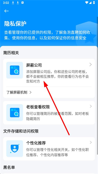 3、在隐私保护页面,找到屏蔽公司选项并点击,进入屏蔽公司的管理界面。