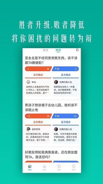 开杠,趣味的辩论软件,软件内含超多开放命题可供用户自由辩论讨论,每天都有全新的辩题上线供用户讨论,很多趣事见闻都可以在这里进行观点讨论,app采取胜者升级败者降级的辩论模式,有需要的用户可以下载使用!