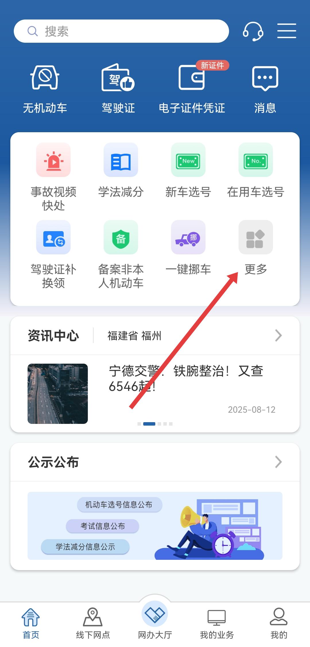 1、打开交管12123APP首页,需要点击主页功能区的更多选项,然后进入业务中心的页面。