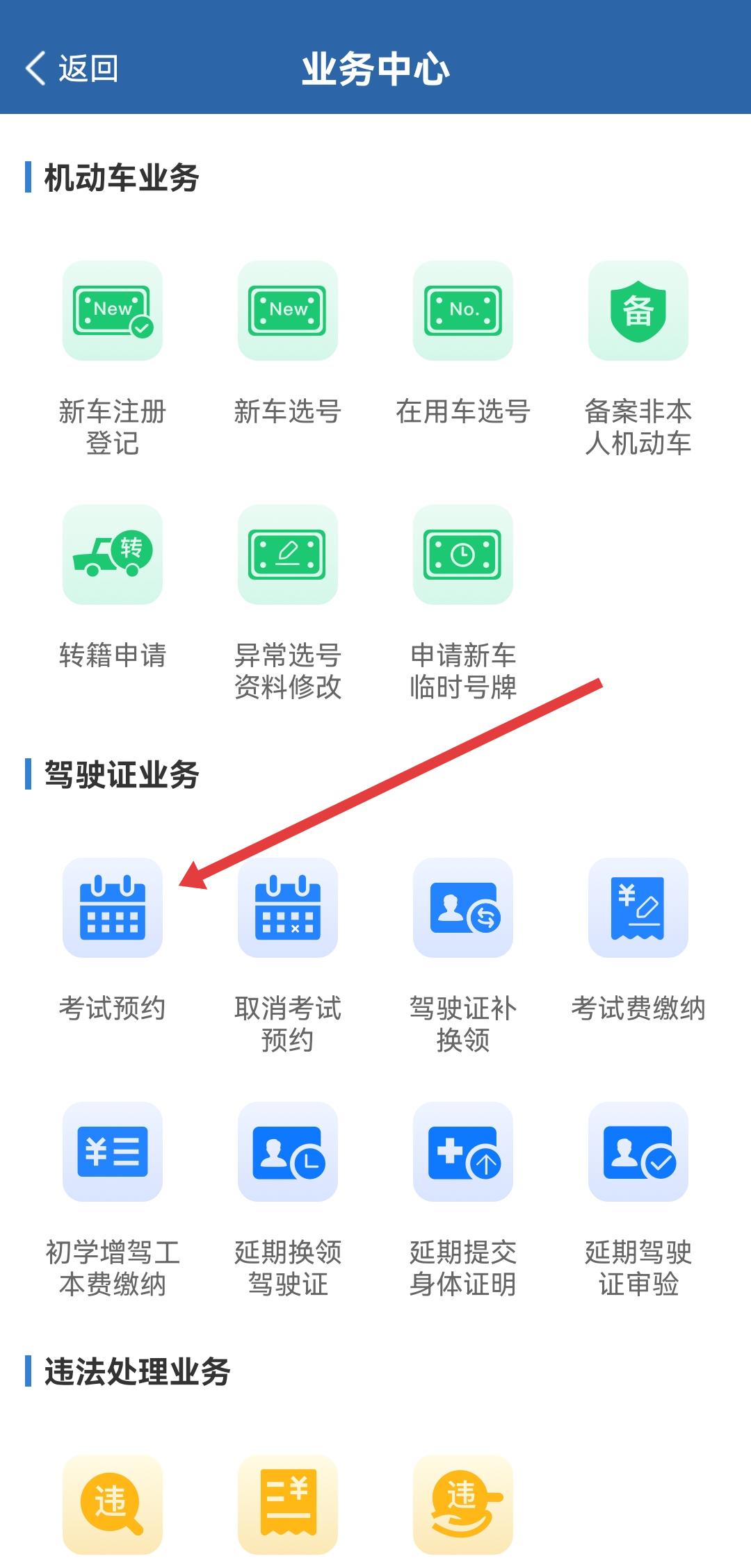 2、在交管12123业务中心的驾驶证业务模块中,点击考试预约的选项,进入考试预约的界面。