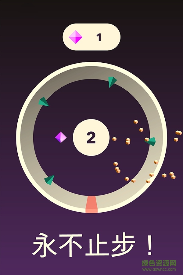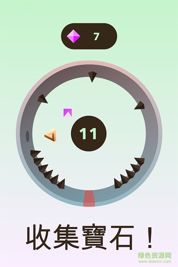 点击屏幕控制着小方块在圆环中跳跃,一定要躲避掉那些冒出来的钉子并且尽你所能的收集宝石,那是解锁的钥匙。