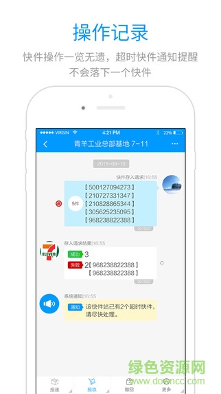 快件操作一览无遗,超时快件通知提醒,不会落下一个快件。