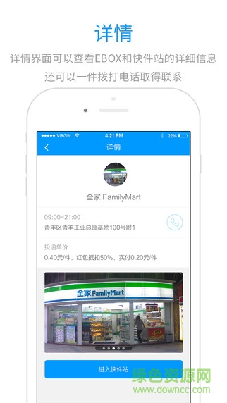 详情界面可以查看易泊快递柜和易泊快件站的详细信息。还可一键拨打电话取得联系。