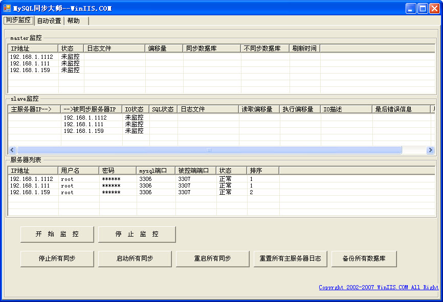 四、打开MySQLSync.exe程序,每一台MYSQL服务器添加一条记录,把他们的root帐号密码添加进去。