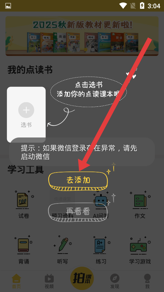 1、在首页按照系统的指示,点击去添加按键,从而到达下一个页面,进入选书流程。