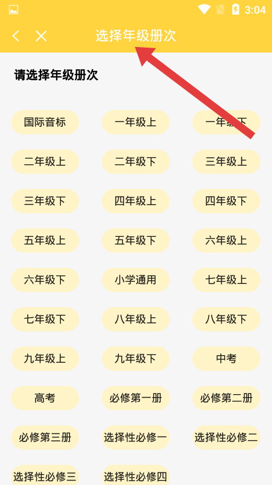 2、根据学生具体学段情况,选择对应的复合学生的年级册次,从而进入对应课本选择页。