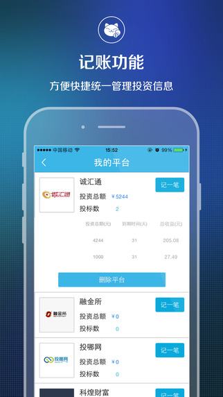 智能自动记账功能目前支持PPmoney、积木盒子、红岭创投、诚汇通、铜掌柜、拍拍贷、融金所、投哪网、金联储、爱投资、麻袋理财、鑫合汇、有利网、珠宝贷、喵喵客、礼德财富、付融宝、e速贷、365易贷。