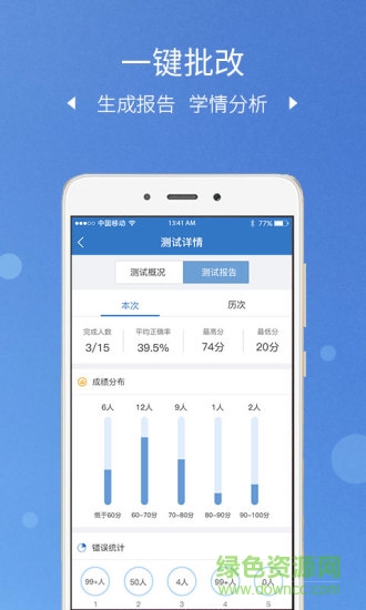 3.一键批改测试题目,自动生成测试结果,显示正确率、成绩和错题统计;