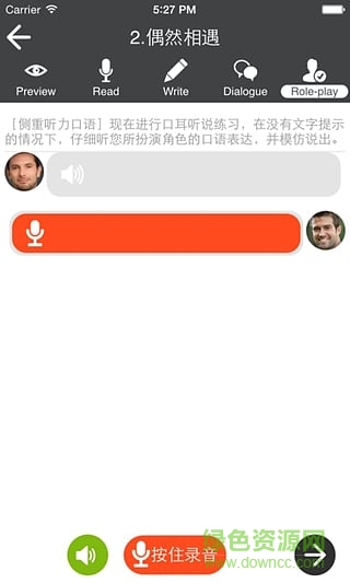 【说】:您可以和外教进行模拟实景会话练习,您选择一个角色来扮演,app可以将您的虚拟会话录音并回放,提升您口语的实用能力。