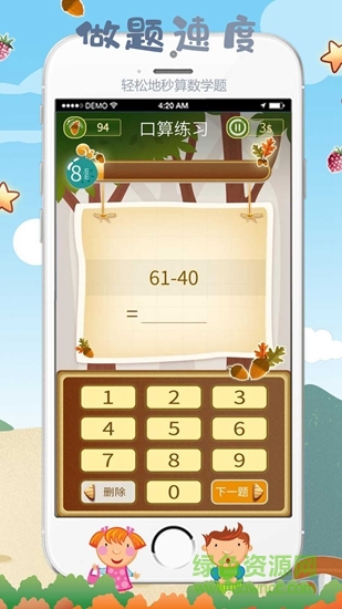 松鼠口算app是一款专业的口算学习软件,采用趣味性的学习方式,闯关玩法激发孩子学习的积极性,学习难点轻松攻克,在线定制报告超快做题,提升数学成绩,欢迎来绿色资源网下载!