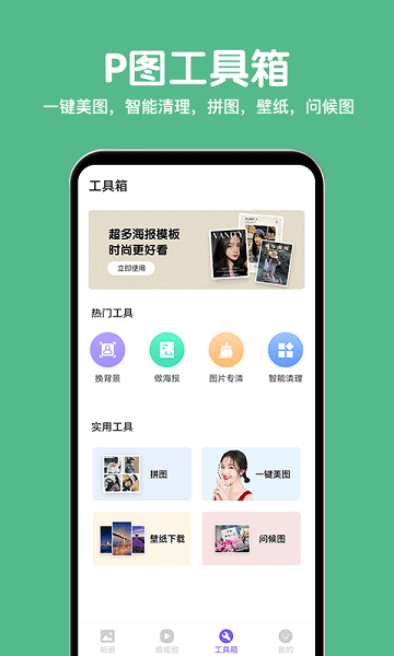 工具箱提供图片智能清理功能、高清海量壁纸、图片拼图编辑等功能。