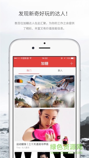 加糖app是一款帮你发现生活乐趣的手机应用,生活本来就是一件无聊的人,而加糖则就是带你发现生活中有趣的事情,发现各种新奇好玩的达人,约见他们一起出发吧,精彩的生活,由你来创造。喜欢的小伙伴快来绿色资源网下载吧!