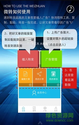 2、植入转发 在朋友圈发现好的文章,复制链接,黏贴到微转工具,即可植入自己的广告发送到朋友圈!