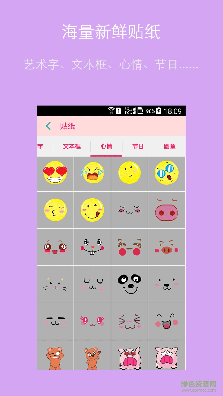 1.清新热门贴纸:艺术字、文本框、心情、节日、图章