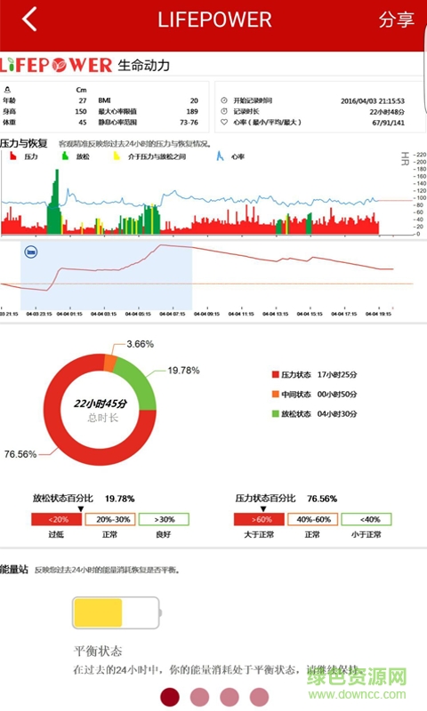 生命动力app是一款24小时连续监测身体状况的手机软件,通过它你可以了解到自己每天的详细数据,包括日常的步行、心率、睡眠,都能通过app进行分析,直观的显示出来。有需要的快来绿色资源网下载吧。