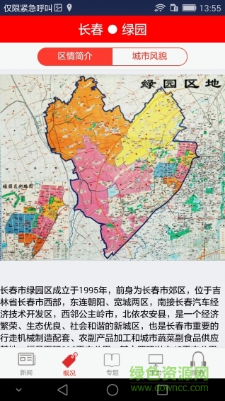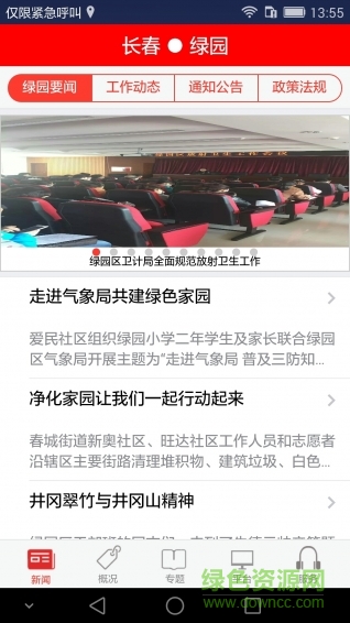 绿园新闻是一款反应绿园区民生生活动态,绿园区政府党政工作的一款新闻类型APP。其中包含新闻,概况,专题,平台,服务这5大模块。