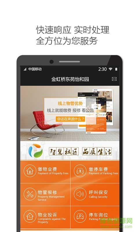 1、物业中心,主要对物业费用等进行管理和缴纳,同时提供居民快速与物业沟通