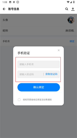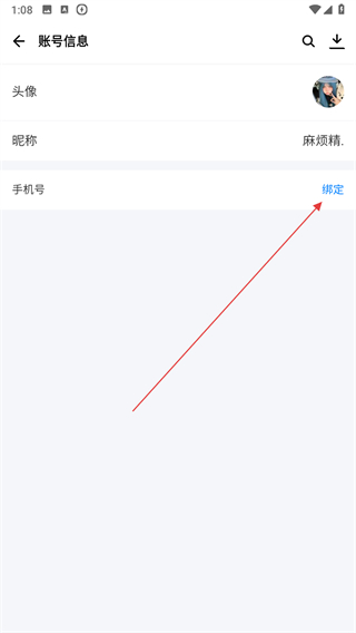 4、在账号信息页面中,点击手机号右侧的绑定按钮。