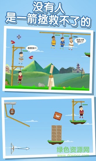 弓箭手拯救大作战是一款休闲类的射击游戏,在游戏中,你的小伙伴被绑在了树上,你需要通过射箭到屏幕指定的地方,才能够把小伙伴救下来,注意千万不要手抖,游戏关卡丰富,一关更比一关难,感兴趣的朋友就来绿色资源网下载安装吧