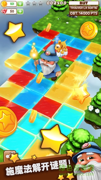 玩家将帮助大巫师通过点亮不同方格的色彩,让相同颜色的土地连成一片可通行的道路,到达光之门。《色彩魔法师》的难点就在于色彩魔法石(屏幕中下方处)的排列和数量都是有所限制的,并且想要得到三星评价通关,还需要注意收集三颗散落在各处的星星,所以如何搭配使用非常关键。另外大巫师每行动一次,前一次的点亮区域都会重新恢复无序的色彩状态。