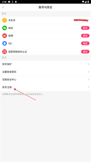 4、在账号与安全页面中,向下滑动找到账号注销选项,即可完成。