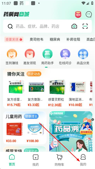 1、打开药房网商城app首页,点击底部导航栏的我的。