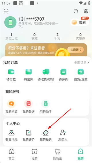 1、在药房网商城App首页点击底部的我的选项,进入个人中心页面。