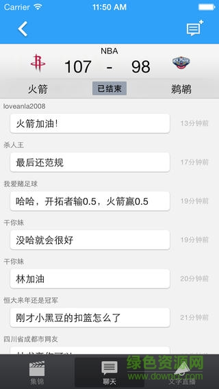 针对每场比赛有单独的聊天室,您可以随时随地和天下体育迷一起交流看法。不管你是湖人、科比、热火、詹姆斯、韦德、巴萨、皇马、拜仁、切尔西、恒大还是其他球队的球迷,在这里,您都能找到组织!