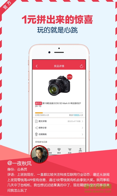 零钱淘app是一款众筹购物的手机软件.用户在这里只需一元便有可能买到自己喜欢的商品,非常的划算,而且怀揣夺宝码等待宝物揭晓的那一瞬间你会不会感觉到刺激呢?感兴趣的朋友们快来下载吧!