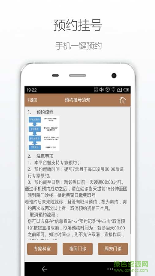 提供本院全部科室专家门诊的预约挂号功能,患者只需一部手机,即可完成预约,并且随时随地查看叫号情况。